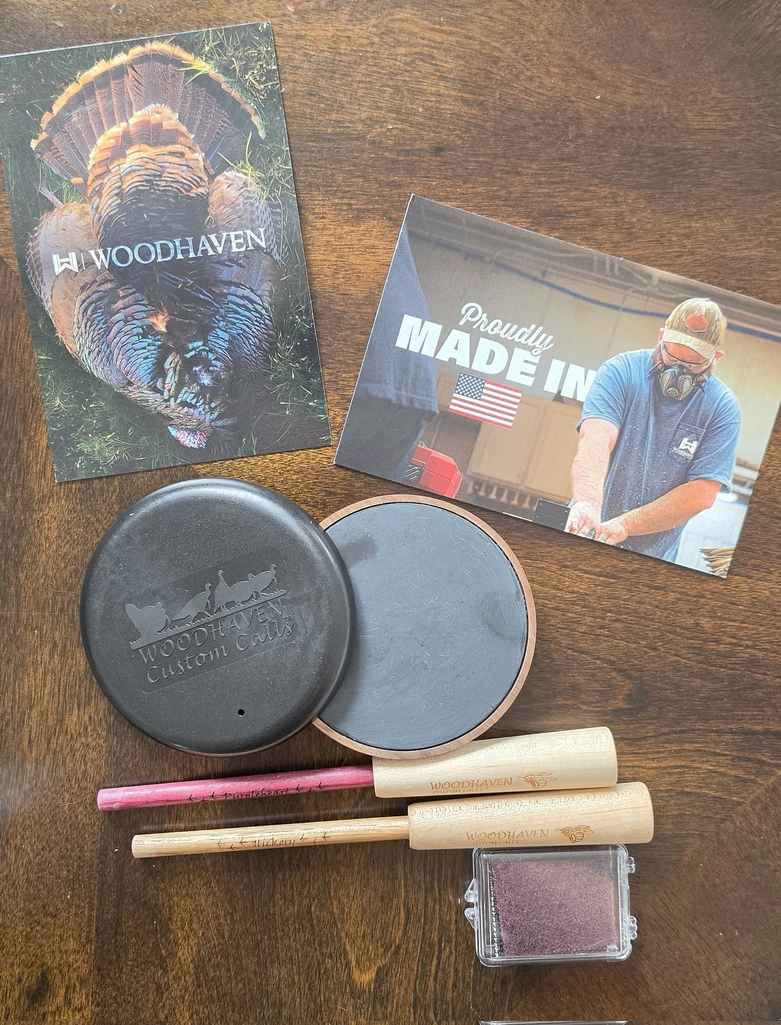 A closer look at the legend slate call setup from WoodHaven Custom Calls, including pot call, strikers, and conditioning kit.