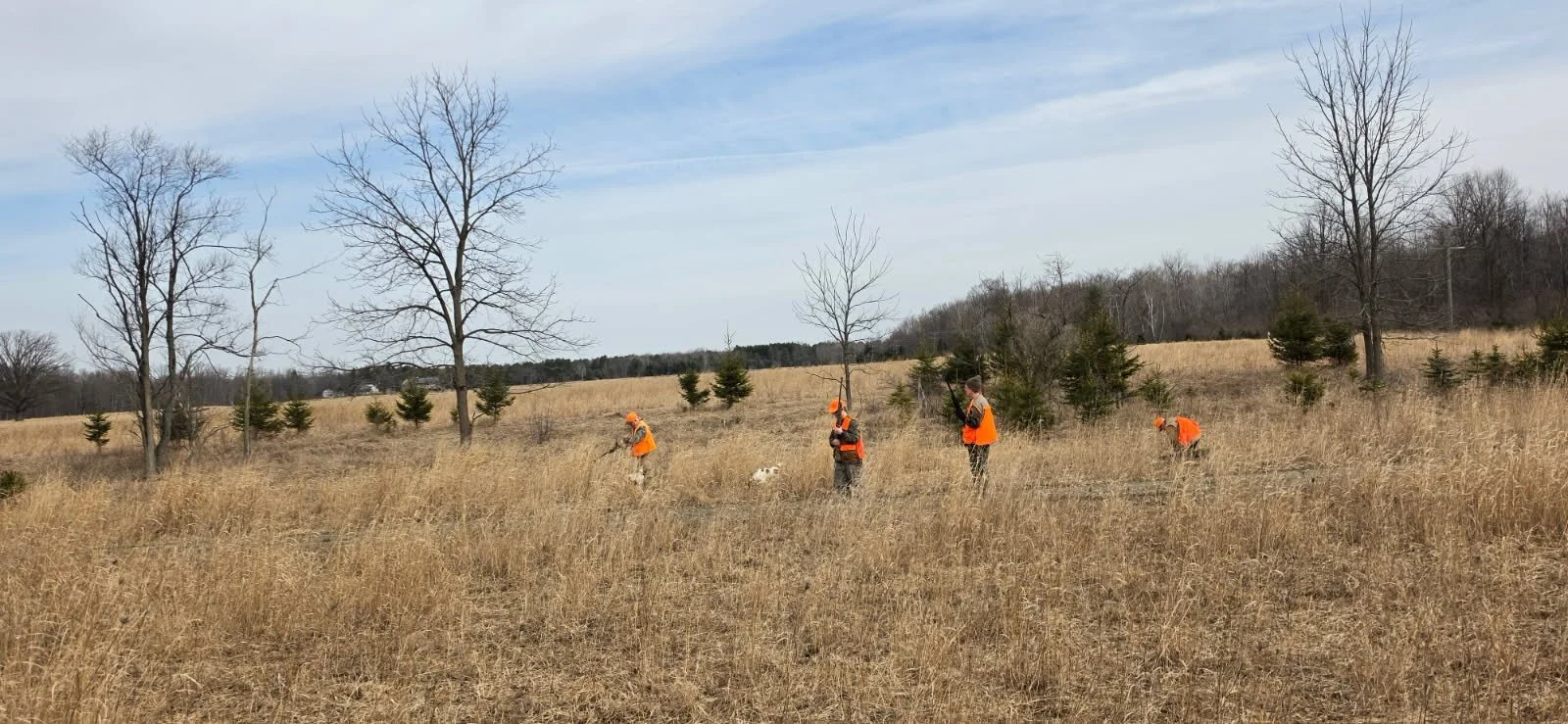 My wife and father-in-law walking a field with a guide and a member of the Oakland County Sportsman’s Club, working cover with dogs during an upland pheasant hunt.